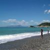 Spiaggia con lettini e ombrelloni, mare azzurro e colline sullo sfondo.