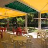 Tavolini e sedie di plastica sotto un tendone giallo in un'area esterna coperta.