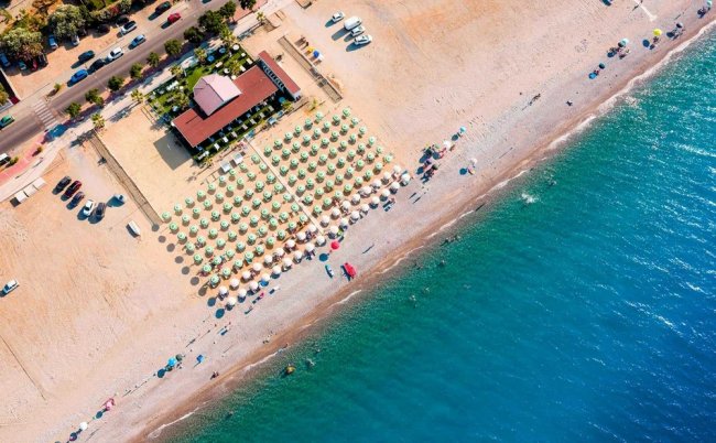Vista aerea di una spiaggia con ombrelloni e mare.